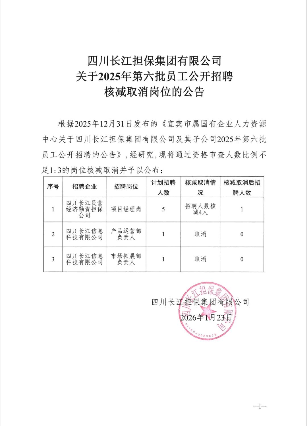 四川长江担保集团有限公司关于2025年第六批员工公开招聘核减取消岗位的公告(访问官网获取详情)