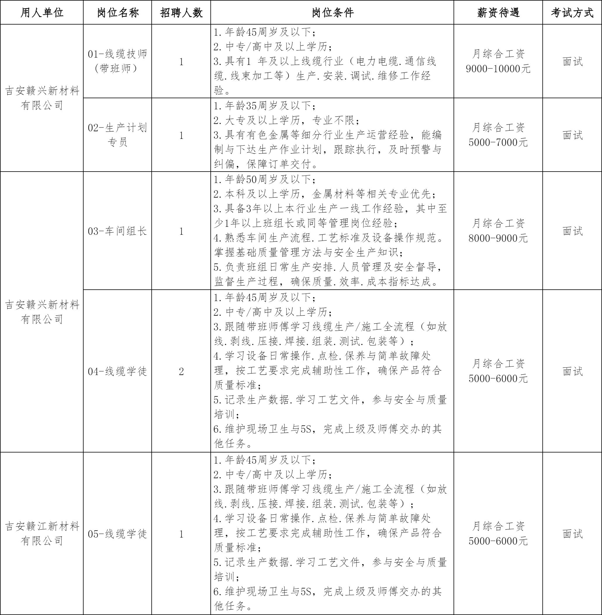 详见附件1《2026年吉安赣兴新材料有限公司及吉安赣江新材料有限公司面向社会公开招聘劳务派遣人员岗位及任职要求》。本次招聘岗位年龄计算方法为:40周岁及以下是指1985年1月1日(含)以后出生,其他年龄计算方式依此类推。招聘岗位要求毕业证书或资格证书获取的时间截至2026年1月1日(含)。