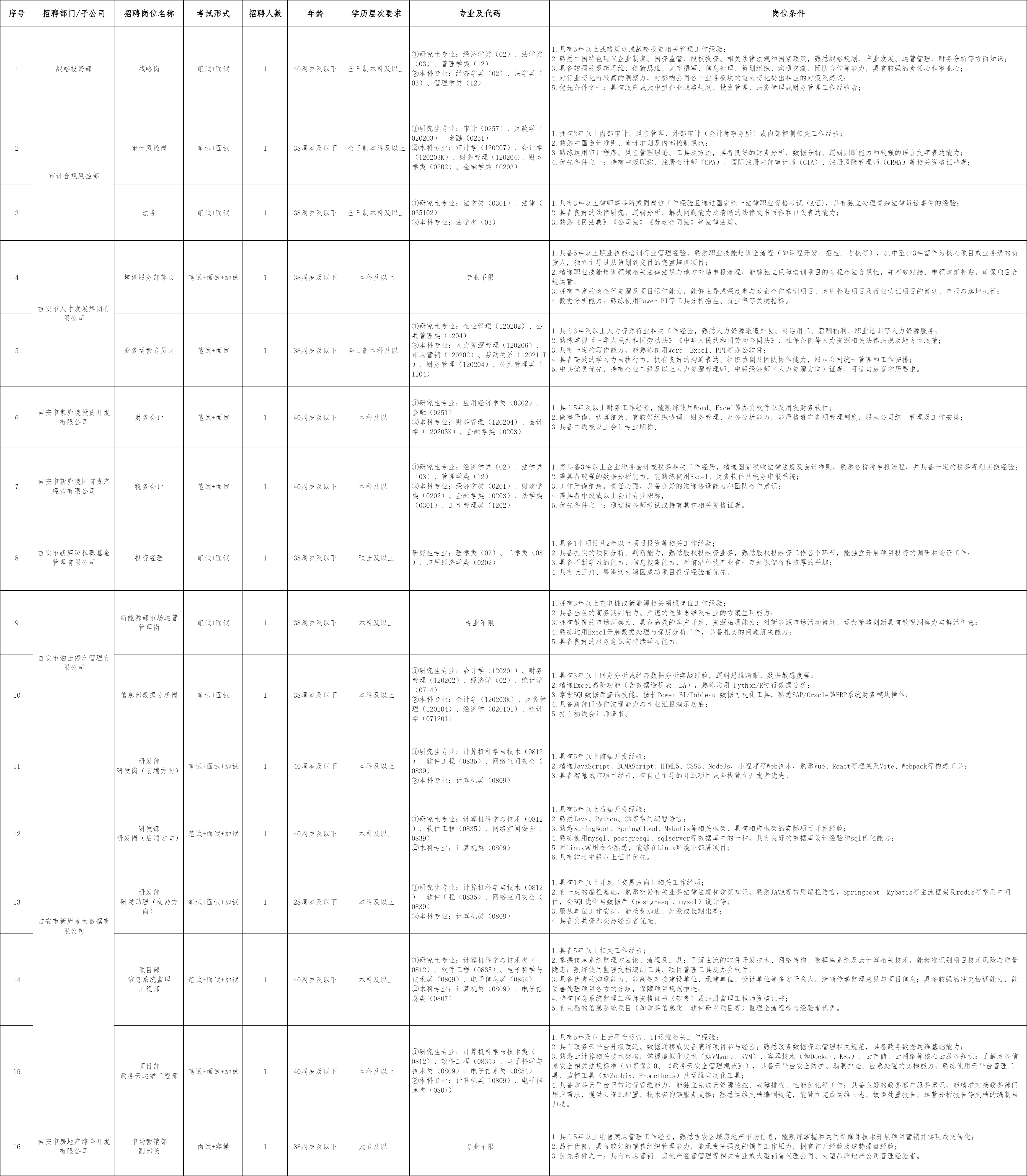 吉安市新庐陵投资发展有限公司成立于2009年,是市属国有综合性投资发展平台,公司注册资本10亿元,信用评级AA+。公司以“产业+资本+平台”为驱动,构建“城市建设、停车新能源、类金融服务、资产经营、数字运营、人才服务”六大业务板块,形成“1+8+N”集团化发展格局。连续三年荣获市属国有企业综合考核第一等次,获评“江西社会责任企业”等多项荣誉。根据业务发展需要,吉安市新庐陵投资发展有限公司及下属子公司决定面向社会公开招聘16名工作人员,现将有关事项公告如下: