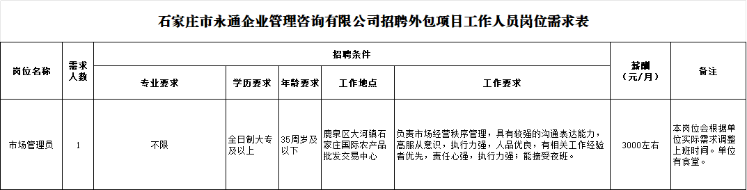 石家庄市永通企业管理咨询有限公司现面向社会公开招聘外包人员,具体招聘事宜公告如下: