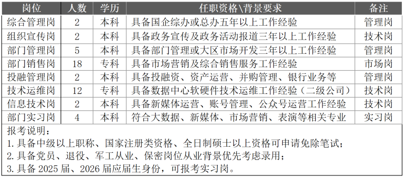 公司以数字数据产业为核心驱动,在人工智能、信息技术、数据综合服务领域构建完整的产业链与产品链,服务国防、军工、军融及地方人才产业。公司内设总经办、综合管理部、军融发展办、数字产业部、投融发展部、人才事业部、综合采购部、市场事业部等“两办六部”。2026年因工作发展需要,现面向社会公开招聘如下:
