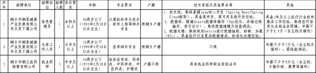 (一)基本条件1.有较好的思想政治素质,勤奋敬业,作风严谨,吃苦耐劳,品行端正、遵纪守法、勤奋好学、热爱本职工作。2.身体健康,无不良嗜好。3.有下列情形之一者不受理报名:①受过刑事处罚的;②处于党纪、政务处分所规定的使用限制期内的;③涉嫌违纪违法正在接受有关专门机关审查尚未作出结论的;④其他不宜应聘的。(二)岗位条件1.信息管理员岗位需本科及以上学历,计算机科学与技术、软件工程等相关专业,桐乡户籍,40周岁以下(1985年2月28日以后出生),具备3年及以上医疗行业软件服务工作经验,熟悉医疗信息化系统业务逻辑。技能要求:①技术栈:熟练掌握Java核心开发(Spring Boot/Spring Cloud框架),具备高并发、高可用系统开发经验;②数据库:精通Oracle数据库操作(SQL优化、存储过程编写、索引设计),熟悉数据建模及性能调优;③数据处理:熟练使用Kettle进行数据抽取、转换、加载(ETL),具备医疗行业复杂数据清洗、标准化处理经验。2.仓库工作人员岗位需大专及以上学历,医学相关专业,35周岁以下(1990年2月28日以后出生),桐乡户籍,需体测。3.执业药师岗位需中专及以上学历,临床医学类、药学类、中药学类、中医药类、护理类专业,50周岁以下(1975年2月28日以后出生),不限户籍,具有执业药师职业资格证书。三、招聘程序