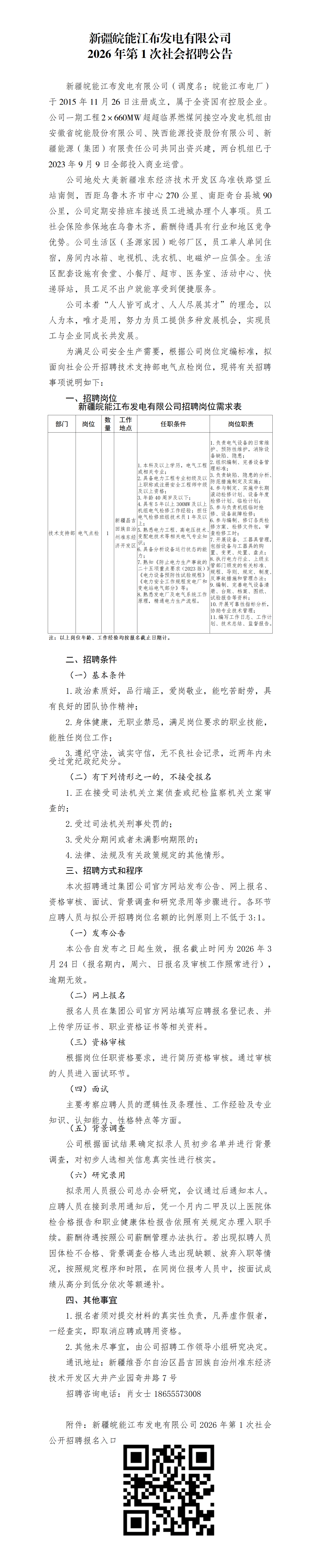 已结束 【合同制】新疆皖能江布发电有限公司2026年第1次社会招聘公告(招若干人,03月10日~03月25日报名)