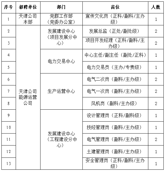 详见《附件1:天津公司招聘岗位主要职责及任职条件》(附件1)。