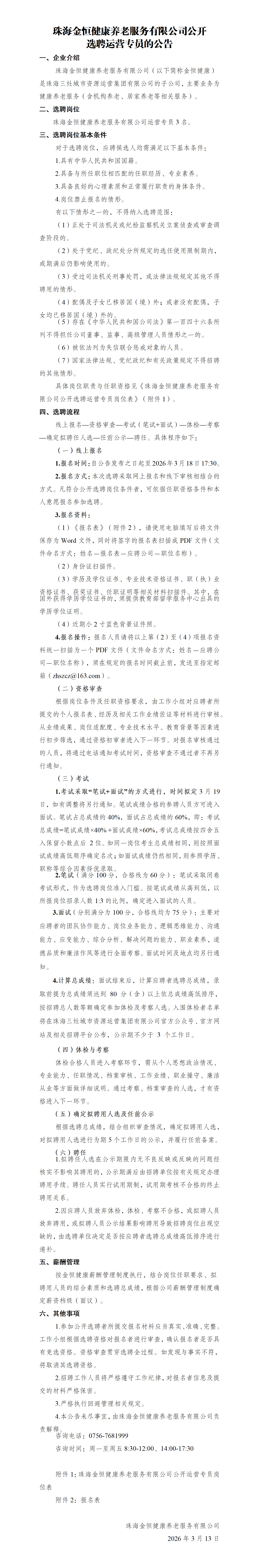 珠海金恒健康养老服务有限公司公开选聘运营专员的公告