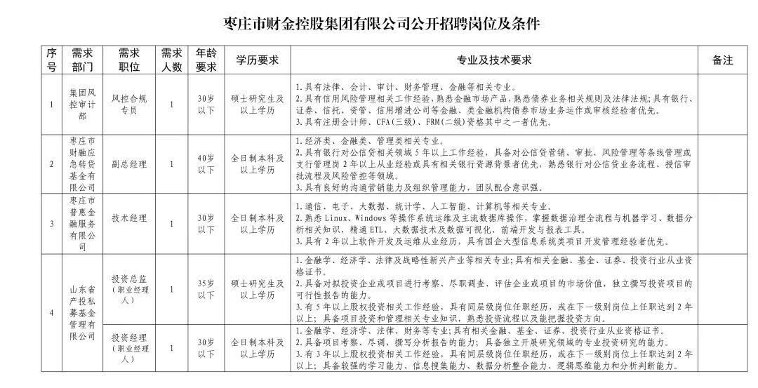 附件:枣庄市财金控股集团有限公司公开招聘岗位及条件