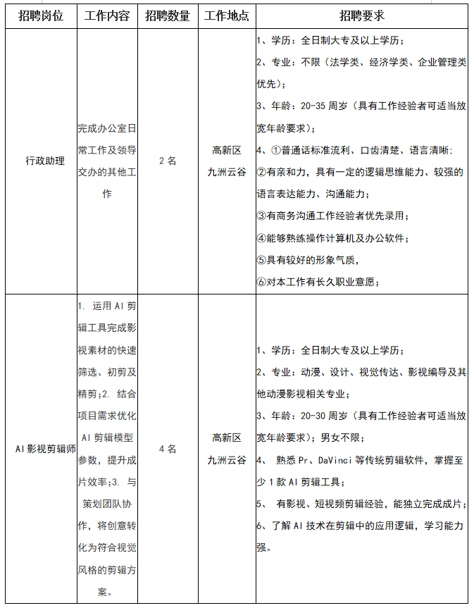 曜石信息科技立足聊城、服务全国,以引领聊城AI制作产业发展、争做区域AI文创领军龙头企业为战略目标,积极搭建本地化AI创作生态圈与产业生态联盟,推动技术、人才、资源、品牌协同共生,助力聊城数字文创产业高质量升级。公司始终坚持“技术赋能创意,内容驱动增长”,以顶尖AI能力与专业服务,为客户与行业创造长期商业价值。公司亮点:聊城首家“AI+影视”创新企业,用技术赋能创意,工作氛围开放,提供接触前沿AI工具的机会,本地人才无需外出即可深耕AI科技影视领域。现因业务发展需要,面向社会招聘工作人员22名。具体招聘事项如下: