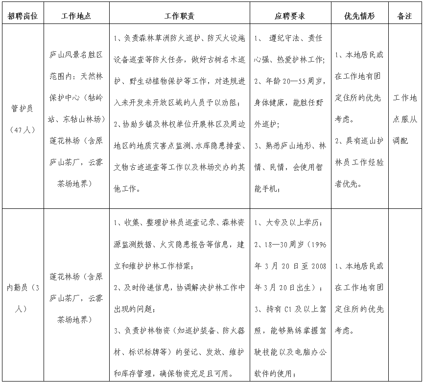 面向社会公开招聘旅游资源管护员50名,其中管护员47名(男性),内勤员3名。具体要求如下: