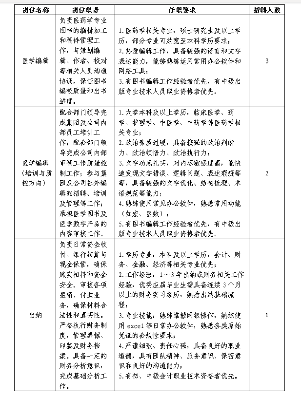 1.具有岗位所需的专业知识或技能,愿意用专业所长服务医学出版工作;