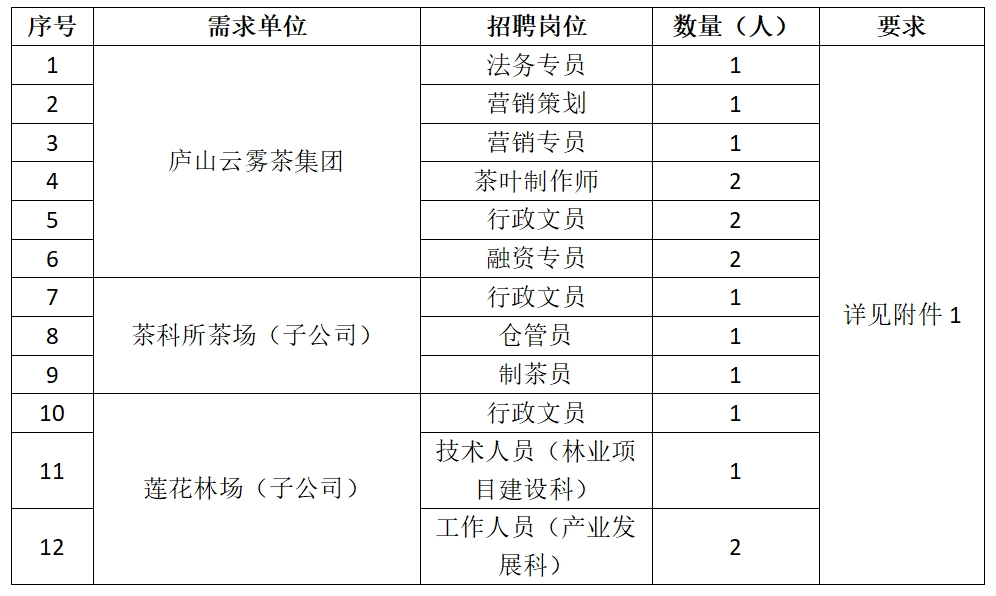 本次庐山云雾茶集团面向社会招聘工作人员16名,具体岗位职责及任职要求详见附件1。