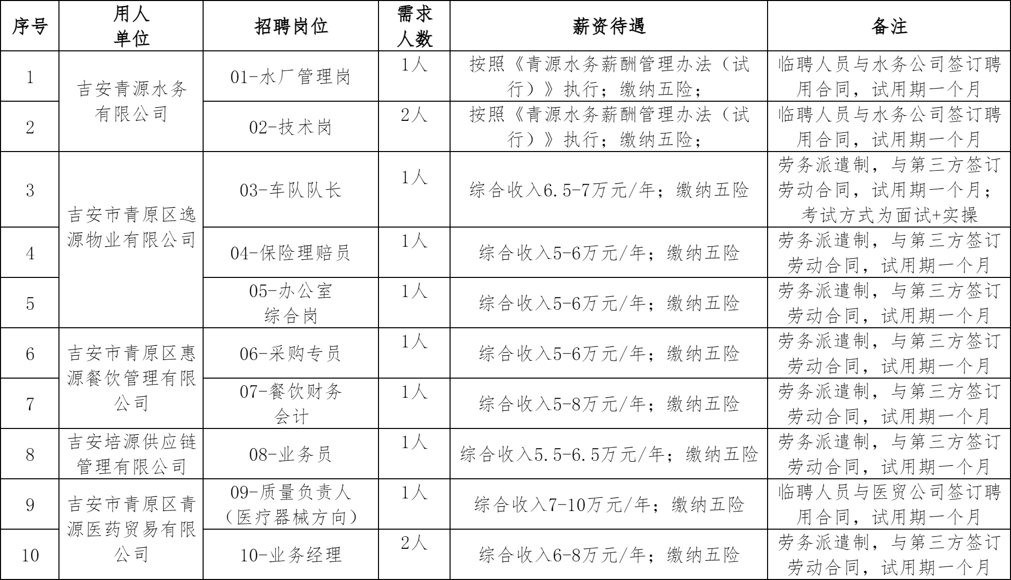 根据工作需要,吉安青源发展集团有限公司下属子公司吉安青源水务有限公司、吉安市青原区逸源物业有限公司、吉安市青原区惠源餐饮管理有限公司、吉安培源供应链管理有限公司、吉安市青原区青源医药贸易有限公司决定面向社会公开招聘12名临聘人员。现将有关事项公告如下:
