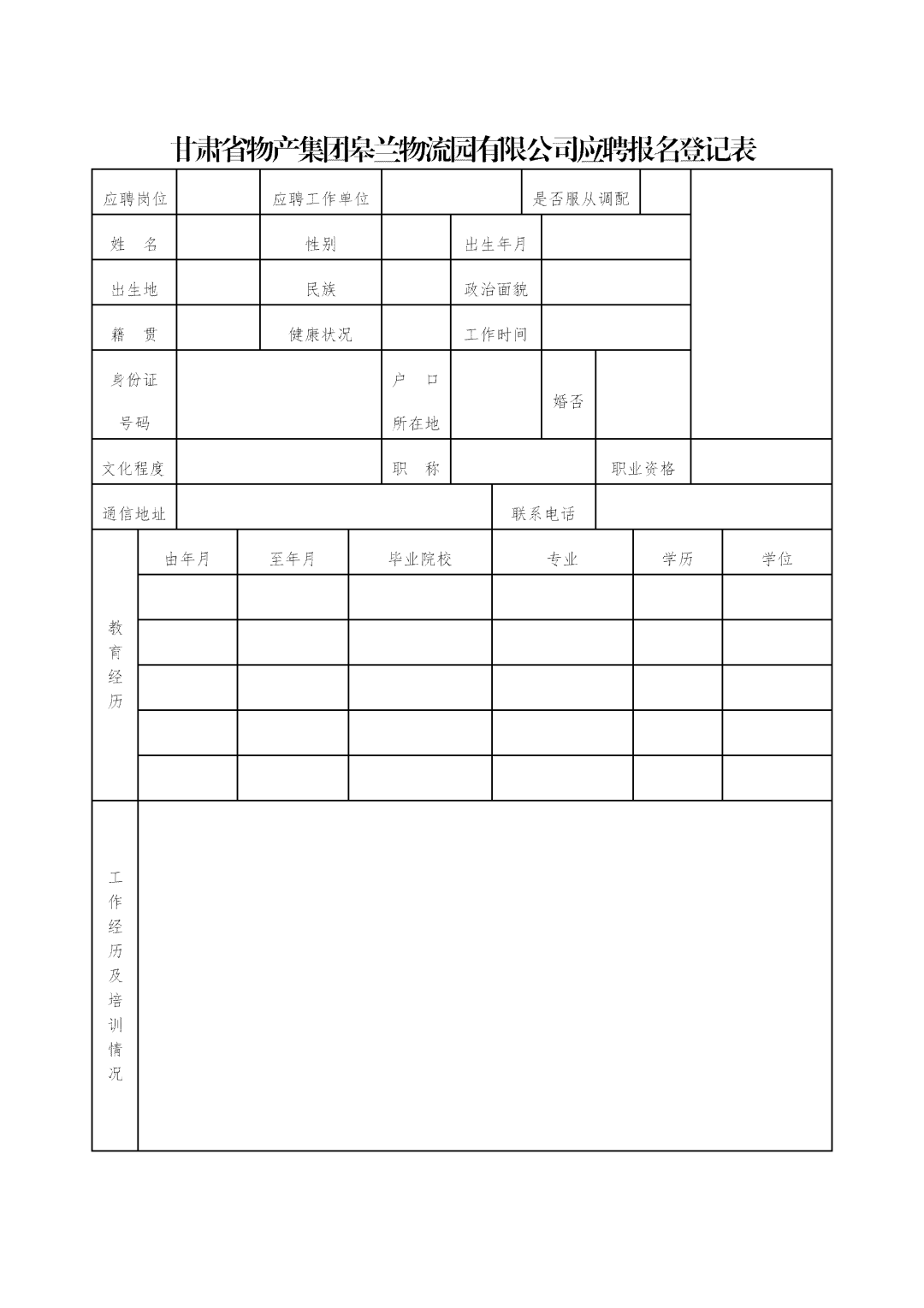 附件:甘肃省物产集团皋兰物流园有限公司应聘报名登记表