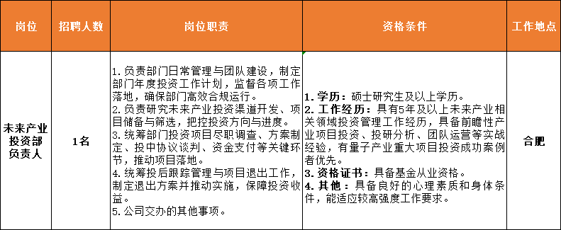计划招未来产业投资部负责人1名。具体信息详见下表。